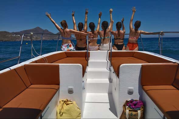 A la hora que hayáis escogido nos encontraremos en el puerto de San José, donde nos estará esperando un barco de 8 metros de eslora con asientos y solárium para navegar cómodamente por la costa del Parque Natural del Cabo de Gata-Níjar.