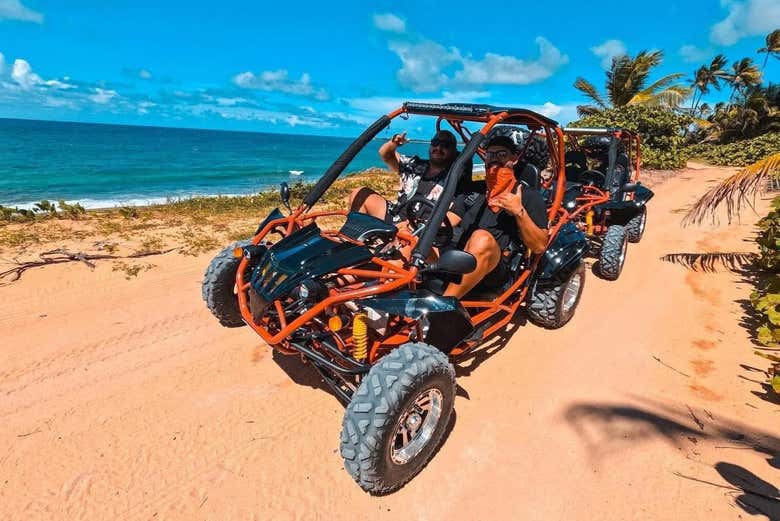 Con las energías repuestas, nos dirigiremos a Piñones, una joya costera al norte de la isla en la que nos pondremos los cascos y subiremos a unos buggies para recorrer esta bonita playa.