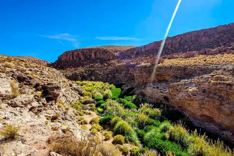 Cuando menos lo esperéis, llegaremos a las orillas del río Vilama, una fuente de aguas termales. Una vez allí, podréis sumergiros en estas cálidas aguas para relajaros y revitalizar los pies para continuar con la caminata. También nos dispondremos a disfrutar de un snack rodeados del entorno único de Atacama.