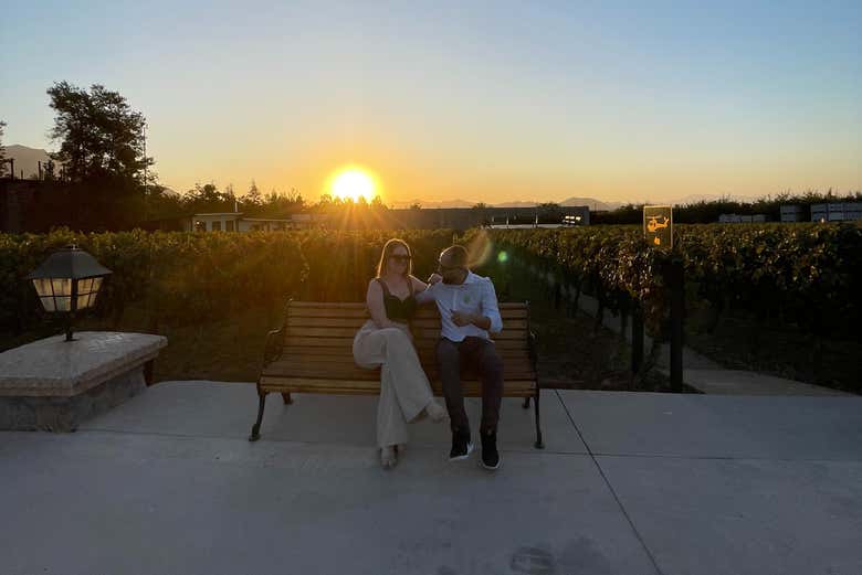 Continuaremos la visita adentrándonos en las bodegas del viñedo, donde conoceréis más sobre el proceso de elaboración de sus vinos y realizaréis otra degustación de vino. Después, nos dirigiremos a un punto estratégico para ver el atardecer sobre las vides y las montañas de la zona, disfrutando de otra cata de vino mientras el sol se pone. ¡No olvidéis inmortalizar el momento!