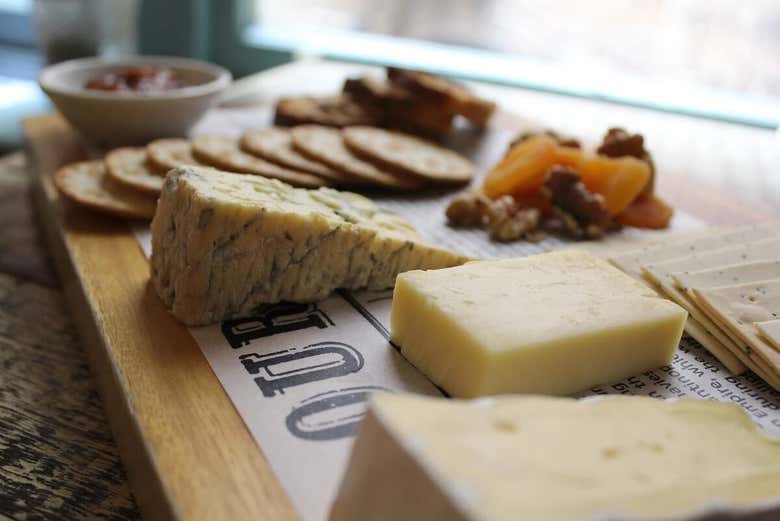 Degustación de 5 quesos y 3 vinos.