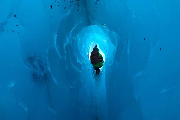 Una vez hayamos llegado a nuestro destino, nos colocaremos los crampones, cogeremos los bastones de trekking e iniciaremos la aventura por los glaciares del parque nacional.