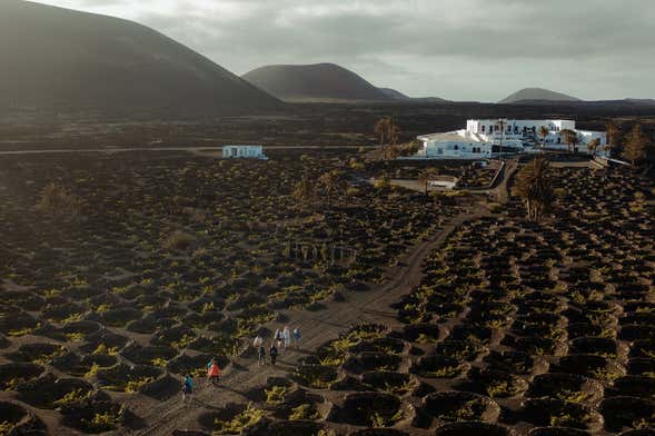 Después de conocer todo acerca de las uvas Malvasía Volcánica y Listán Negro, haremos una cata de dos vinos ecológicos mientras contemplamos el curioso paisajes de viñedos que nos rodea. ¿Sabéis cómo influyeron las erupciones volcánicas del Timanfaya en estas tierras?