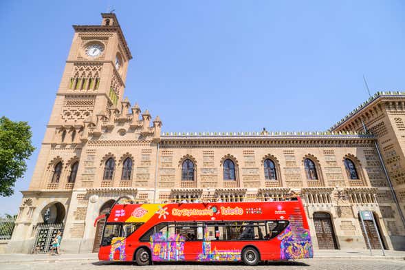 El autobús turístico de Toledo consta de 10 paradas. Podéis completar la ruta en 50 minutos o bajar y subir en cualquiera de las paradas haciendo el recorrido a vuestro ritmo a bordo de un autobús descapotable de 2 plantas. Durante todo el trayecto disfrutaréis de comentarios grabados en español sobre los lugares que se recorren.