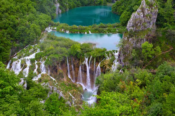 Nuestra primera parada tendrá lugar en el Parque Nacional de los Lagos Plitvice, un entorno único declarado Patrimonio de la Humanidad. Realizaremos un tour a pie por sus diferentes senderos de madera, desde los cuales observaremos el fascinante espectáculo natural que forman los lagos y cascadas de Plitvice. ¡Sus saltos de agua alcanzan varias decenas de metros de altura!