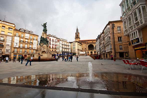 Nuestra ruta por el centro histórico de Vitoria comenzará en la Plaza de España, frente a la Oficina de Turismo. A pocos metros hallaremos la icónica Plaza de la Virgen Blanca, presidida por el monumento a la batalla de Vitoria. Su conjunto escultórico alude a los enfrentamientos bélicos ocurridos en junio de 1813.