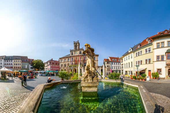 La visita guiada a pie por Weimar comenzará en la plaza de la fuente de Neptuno. Descubriremos la plaza del mercado o Markt, donde el estilo medieval del Ayuntamiento destaca entre los edificios tradicionales.