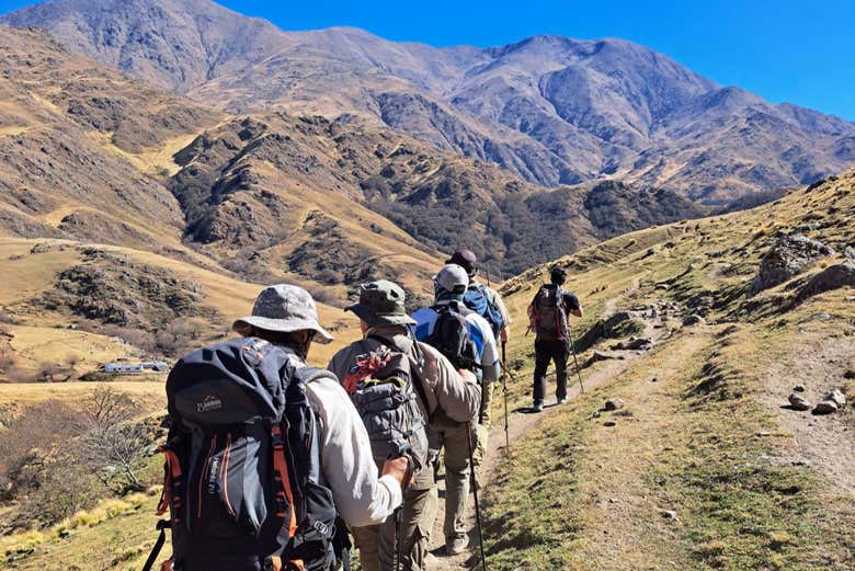 Arrancaremos esta ruta de trekking de 20 kilómetros en total caminando la primera parte cuesta arriba. Esta parte inicial nos llevará una hora y 15 minutos aproximadamente. Al llegar, haremos una merecida pausa para admirar el valle de colores ocre que se extiende a nuestros pies.