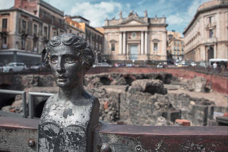 Votre premier arrêt sera l'amphithéâtre romain, un monument très important qui, bien que visible en surface, fait partie de la visite souterraine du centre historique. Cet édifice antique, datant du IIᵉ siècle après J.-C., se trouve aujourd'hui dans le parc archéologique gréco-romain de Catane et constitue une visite incontournable de la ville.