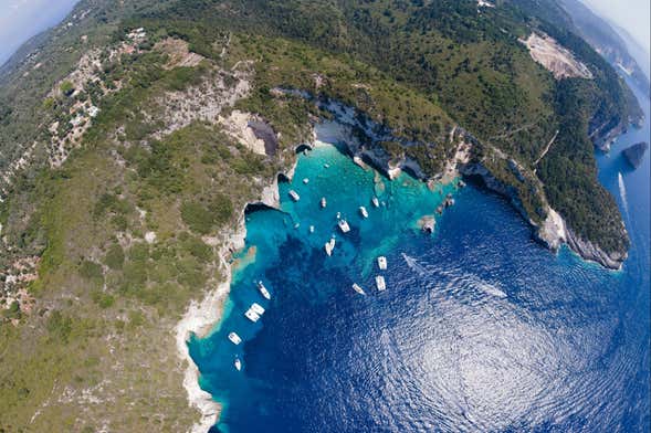Par la suite, vous naviguerez vers la petite île d'Antipaxos pour vous baigner à Paradise Beach (Voutoumi). Vous naviguerez également le long de la côte est de Paxos et profiterez d’une vue magnifique sur les petites îles de Skaltsonisi et Mongonisi avant de retourner à Corfou.