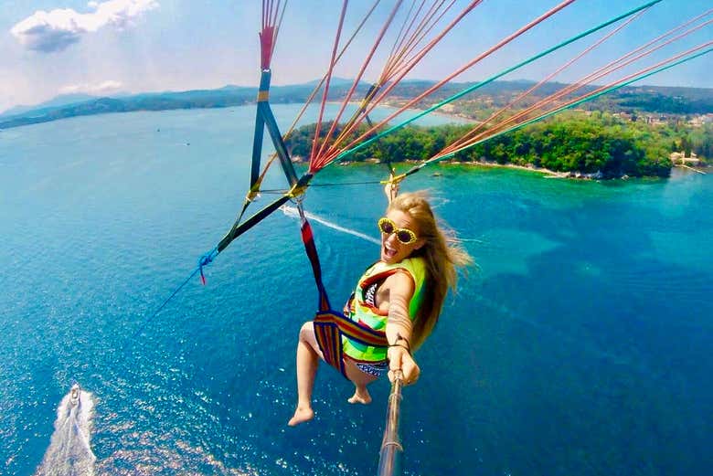 Alors que vous vous éloignerez du port, vous admirerez la côte spectaculaire et la vue panoramique sur Corfou. Vous arriverez au niveau de la zone de vol et, lorsque le vent sera favorable, vous enfilerez votre gilet de sauvetage, votre corde et vous assiérez sur la plateforme du bateau pour le décollage. C'est parti !