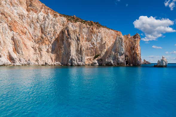 Vous mettrez le cap sur le Cap Vani, où vous verrez une ancienne mine utilisée au XIXe siècle. Pendant la traversée, vous verrez également la baie de Triades et Ayios loannis et vous arriverez à la première étape du circuit : Sykia. Saviez-vous que c'est la plus grande grotte de Milos ? Impressionnant !