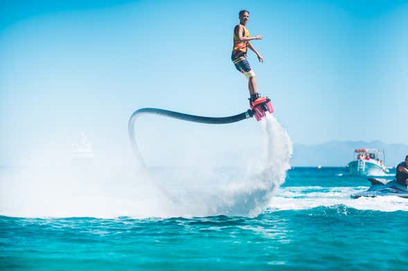 Poussé par un canon à eau, vous sentirez vos pieds quitter la surface pour "voler" au-dessus de la mer. Peu importe si vous tombez, se relever et se remettre sur pied est plus facile qu'il n'y paraît. Vous vous sentirez comme un vrai super-héros en sautant, en tournant et en glissant sur la mer. Une expérience inoubliable !