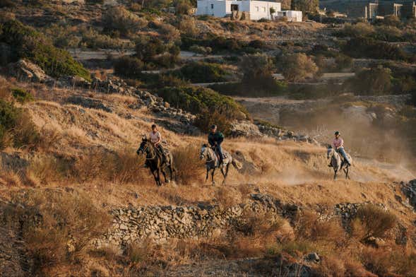 Cette balade à cheval à Paros commencera lorsque le soleil commencera à disparaitre à l'horizon et que le paysage prendra une couleur orangée. À cheval, vous passerez par la plage d'Agia Irini, où vous vous arrêterez pour prendre un café ou un rafraîchissement.