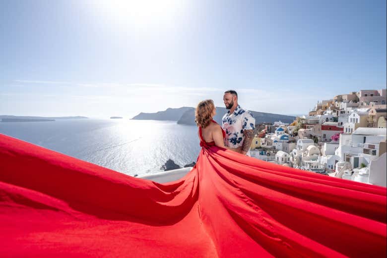 Un photographe veillera à ce que vous vous sentiez comme de véritables mannequins tout en posant dans les ruelles de Santorin. Lors de la réservation, vous pourrez choisir de réaliser votre album avec vos propres vêtements ou avec une robe volante. Il s’agit d’une robe longue en tissu léger, conçue pour produire un effet spectaculaire sur les photos grâce à son mouvement fluide. À vous de choisir !