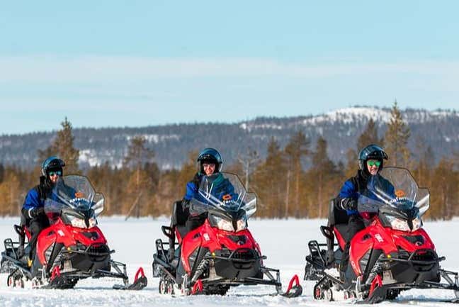 À 10h00, nous viendrons vous chercher à votre hôtel à Ylläsjärvi. Vous monterez sur les motoneiges et commencerez à explorer les forêts enneigées de Laponie. Ce sera une journée inoubliable !