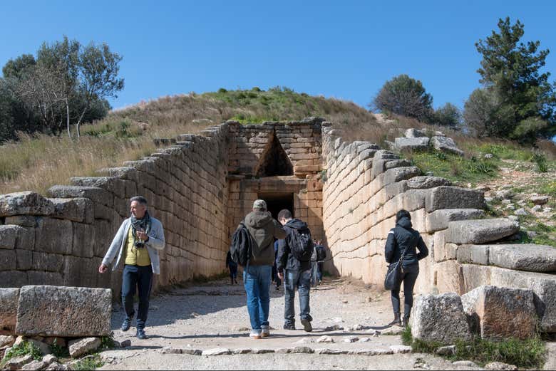 Da lì, passerete davanti alle rovine del palazzo reale di Agamennone e al Tesoro di Atreo, noto anche come Tomba di Agamennone. Questo edificio circolare è un emblema dell'architettura micenea, caratterizzato dalla forma a “Tholos”, come la maggior parte dei monumenti funerari greci. Vedrete inoltre che Micene è circondata da un grande muro che, secondo la tradizione locale, fu costruito dai Ciclopi.