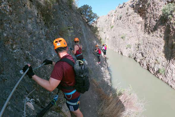 Seguiremos o trajeto de grampos e corda fixas atravessando as gretas e altas paredes verticais que superam os 100 metros de altura admirando as incríveis vistas do cânion de Almadenes e do rio Quípar.